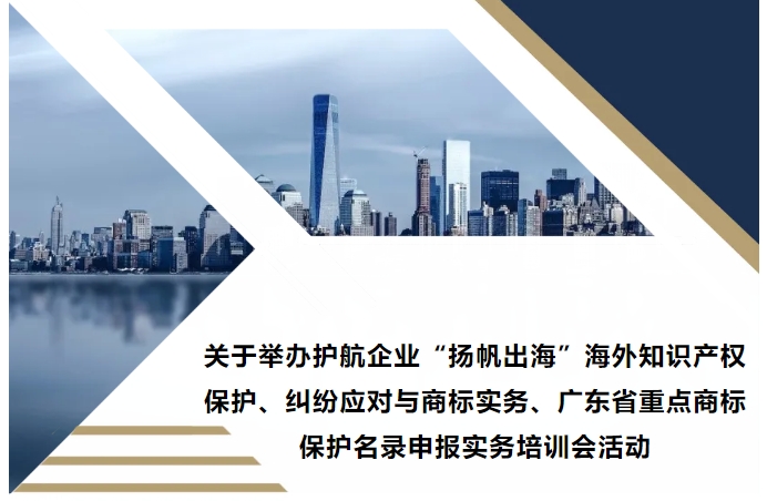• 關(guān)于舉辦護(hù)航企業(yè)“揚(yáng)帆出?!焙M庵R(shí)產(chǎn)權(quán)保護(hù)、糾紛應(yīng)對(duì)與商標(biāo)實(shí)務(wù)、廣東省重點(diǎn)商標(biāo)保護(hù)名錄申報(bào)實(shí)務(wù)培訓(xùn)會(huì)活動(dòng)